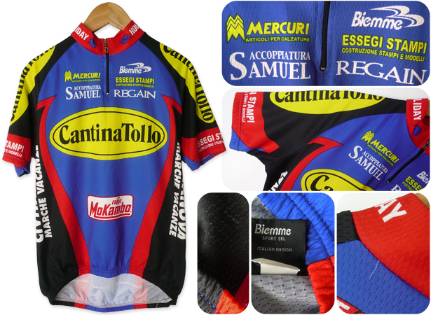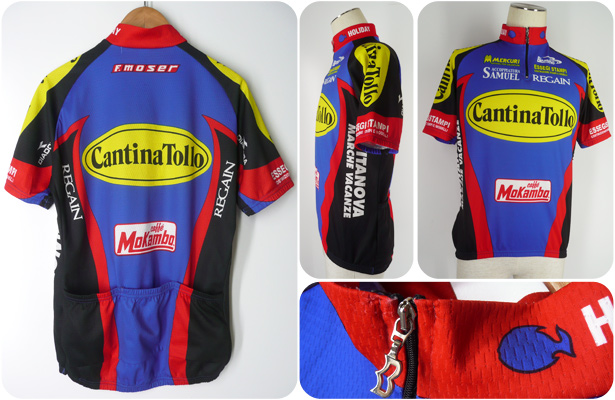 F.moserフランチェスコ・モゼールのサイクリングシャツです。ボディーはbiemmeビエンメ、薄手のメッシュ素材。イタリアワインメーカーのCantina Tolloカンティーナトッロ、モカンボカフェ、Diadoraディアドラ、チヴィタノーヴァマルケなどのスポンサーや地名が入っています。