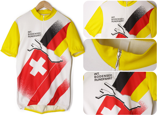 INT.BODENSEE RUNDFAHRTのサイクリングウェアです。ドイツとスイスの境目にあるボーデン湖のコースです。白×黄×赤のカラーリング。OPTIジッパー。