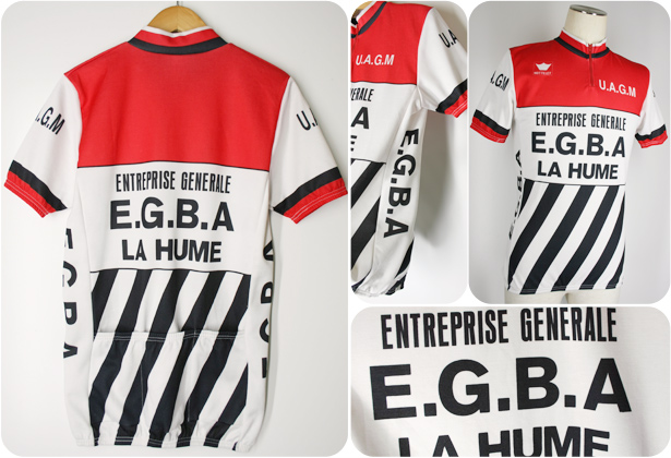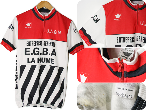 フランスのスポーツクラブU.A.G.Mのサイクリングウェアです。黒×白×赤のカラーリングで、ストライプ柄のデザインです。entreprise generale E.G.B.A la hume電気工事メーカーのスポンサーが付いています。80年代頃のHotteletボディー。YKKジッパー、フランス製です。